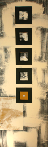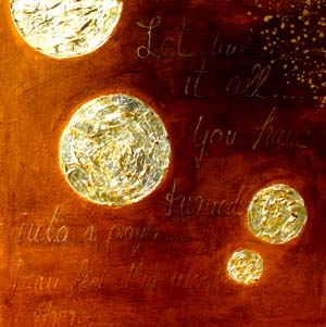 Künstleracrylfarbe, Sand, Strukturpaste fein & grob, Schlagmetall gold, Acrylbinder & Zeitung auf Leinwand Firnis seidenmatt